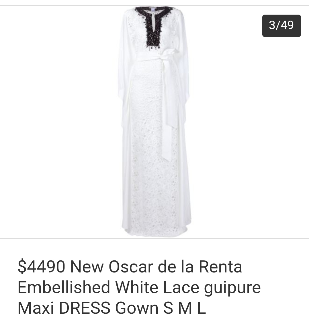Wife of the President Aisha Buhari wore this $4490 Oscar De La Renta Magnolia Guipure Caftan dress when she received the First Lady of the Republic of Uganda, Janet Museveni who paid her a courtesy visit at the Presidential Villa on Friday 15th September. You might want to confirm the price on eBay…