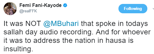 Former Minister of Aviation, Femi Fani- Kayode, says the voice in the recorded audio tape is not that of President Buhari.