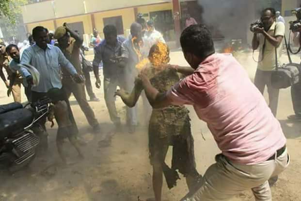 According to the police said that the 27- year-old, who is apparently working in a mill in Coimbatore, brought his wife and two daughters to the district collectorate when a grievance redressal meeting was underway around 10.30 am. Suddenly, Esakimuthu emptied a can of kerosene on him and family, and set them all ablaze.