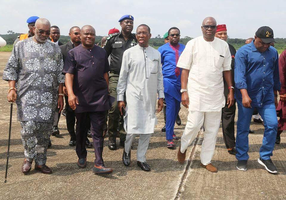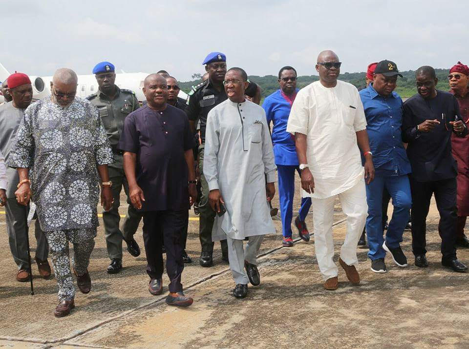 Rivers State Governor, Nyesom Ezenwo Wike (2nd left); Delta State Governor, Senator Ifeanyi Okowa (m) Governor of Ekiti State and Chairman, PDP Governor’s Forum, Ayodele Fayose (2nd right); National Secretary PDP, Senator. Ben Obi (left) and the Former Deputy Speaker, House of Representatives, Rt. Hon. Austine Okpara, when Governor Okowa received the National Committee for the Anambra PDP Governorship Primaries, at Asaba Air Port. Rivers State Governor, Nyesom Ezenwo Wike (2nd left); Delta State Governor, Senator Ifeanyi Okowa (m) Governor of Ekiti State and Chairman, PDP Governor’s Forum, Ayodele Fayose (2nd right); and National Secretary PDP, Senator. Ben Obi (left) when Governor Okowa received the National Committee for the Anambra PDP Governorship Primaries, at Asaba Air Port. Rivers State Governor, Nyesom Wike (m) ; Delta State Governor, Senator Ifeanyi Okowa (r) and National Secretary PDP, Senator. Ben Obi, when Governor Okowa received the National Committee for the Anambra PDP Governorship Primaries, at Asaba Air Port. Rivers State Governor, Nyesom Ezenwo Wike (2nd left); Delta State Governor, Senator Ifeanyi Okowa (m) Governor of Ekiti State and Chairman, PDP Governor’s Forum, Ayodele Fayose (2nd right); National Secretary PDP, Senator. Ben Obi (left) and the Former Deputy Speaker, House of Representatives, Rt. Hon. Austine Okpara, when Governor Okowa received the National Committee for the Anambra PDP Governorship Primaries, at Asaba Air Port.