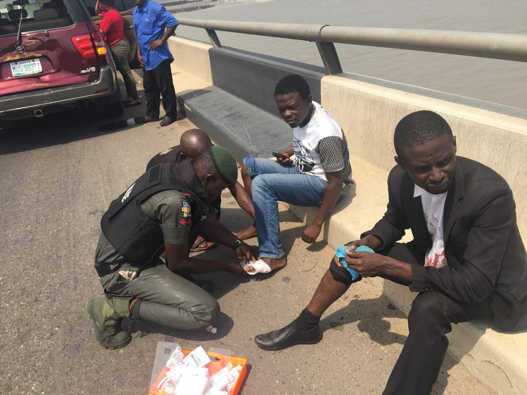 A Volkswagen LT Lagos colour commercial bus, with the registration number BOG 340 XR had a break failure. It rammed a Sequoia Toyota (MUS 953 BZ) after brushing a Honda Accord (RSH 163 CL). Over 4 passengers in the Volkswagen bus sustained various forms of injuries which necessitated the deployment of First Aid treatment by the Rapid Response Officers before the arrival of medical personnel.