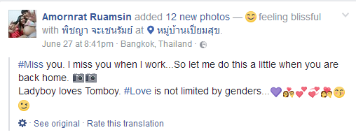 maternity shoots. All the reports and TV interviews by local media are written in Thai. However, on one of her posts, she described herself as a ladyboy’ (transgender) and her wife as ‘tomboy’.