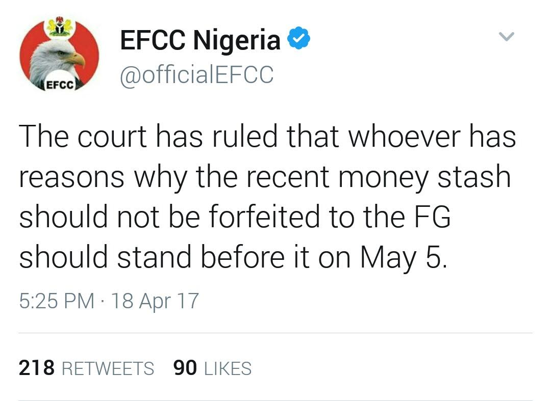 revealed that a court has ruled that whoever has reasons why the recent money stash should not be forfeited to the FG should stand before it on May 5.