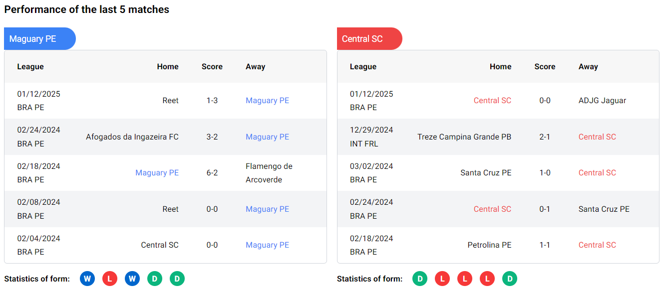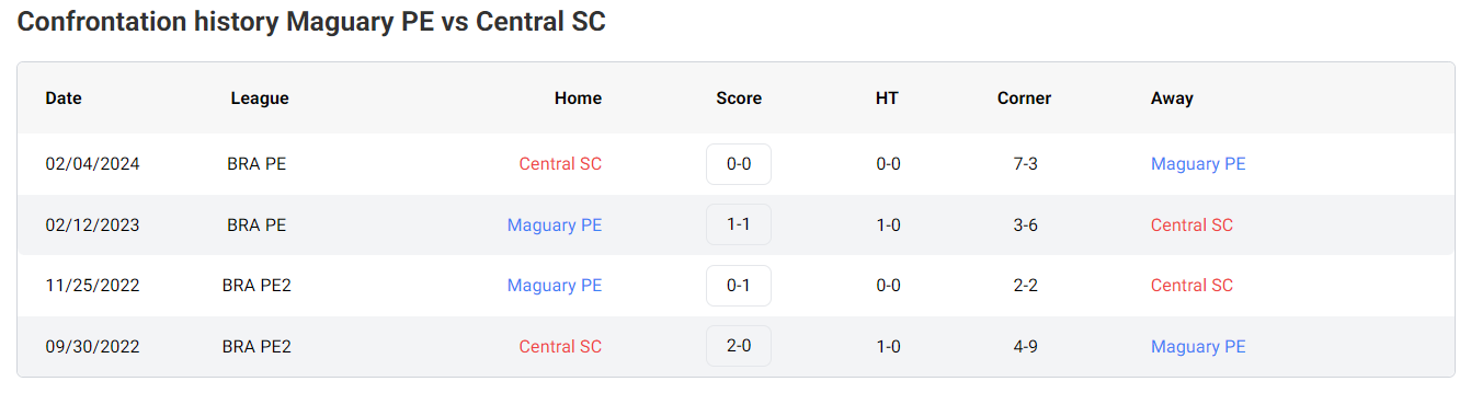 In their last four encounters, Maguary PE has won 0, drawn 2, and lost 2. The average number of goals scored in these matches is 1.25. Their most recent meeting ended in a 1-1 draw.