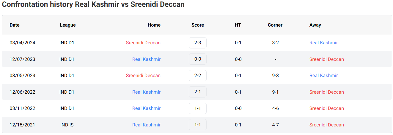 Head-to-Head (H2H) Results for Real Kashmir vs Sreenidi Deccan
