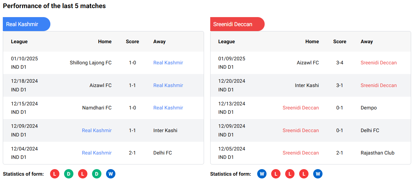- Real Kashmir FC: 2 wins, 3 draws, 2 losses in their last seven matches.
